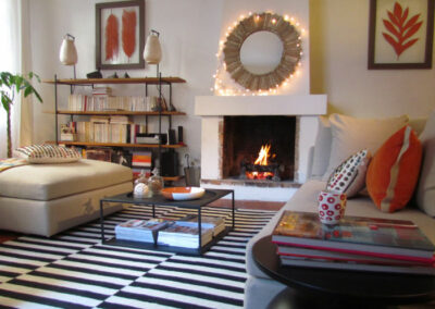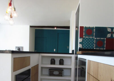 The floor of the first floor – in the living room – was removed to create a ceiling height of over 5 metres. All the living areas were created: several bedrooms, bathrooms, a brick-built kitchen, a footbridge on the first floor giving access – from the mezzanine – to the friends’ sleeping area, etc. Many of the furnishings were designed and made to measure.r..