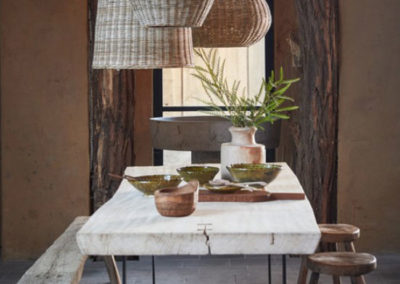 Here are a few examples of different pendant lights working together in the same large space. A mix of materials, shapes, sizes and shades that work together: a large papier-mâché hanging light in dark grey and gold above the island in the brick-built kitchen, a “cluster” of 5 hanging lights in natural fibres above the entrance to take up the space of the beautiful ceiling height of over six metres, a Georges hanging light above the dining table whose terracotta echoes two sections of wall in the same shade in the nearby kitchen…